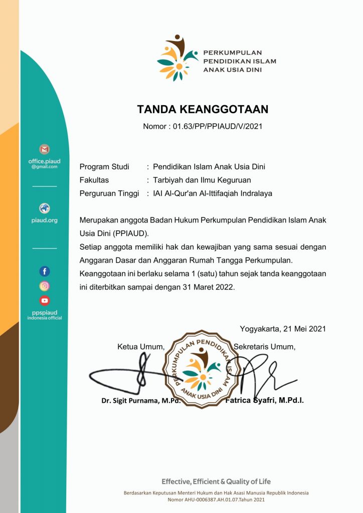 Pengakuan secara resmi tersebut termaktub dalam surat keanggotaan Perkumpulan Pendidikan Islam Anak Usia Dini yang ditandatangani oleh Ketua Umum dan Sekretaris Umumnya, yaitu Dr. Sigit Purnama, M.Pd. dan Fitrica Syafri, M.Pd.I. di Yogyakarta tertanggal 21 Mei 2021.