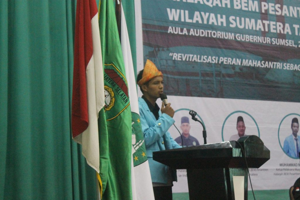 Kegiatan ini di bukak oleh Dr. H. Rosidin hasan M.Pd.i. Asisten 1 pemerintahan dan kesra sekretariat daerah provinsi sumsel beliau juga berpesan kepada pengurus wilayah Sumatera agar amanah dan penuh tanggung jawab dalam melaksanakan tugas-tugasya ,kegiatan muswil yang dilaksanakan di Sumatera Selatan ini bisa menghasilkan program-program kerja wilayah Sumatera khususnya di Sumatera Selatan sehingga bisa bersinergi penuh membantu pihak pemerintahan dalam mensukseskan program-program daerah. Santri harus mampu beradaptasi terhadap perkembangan zaman era bonus demografi digitalisasi society 5.0,