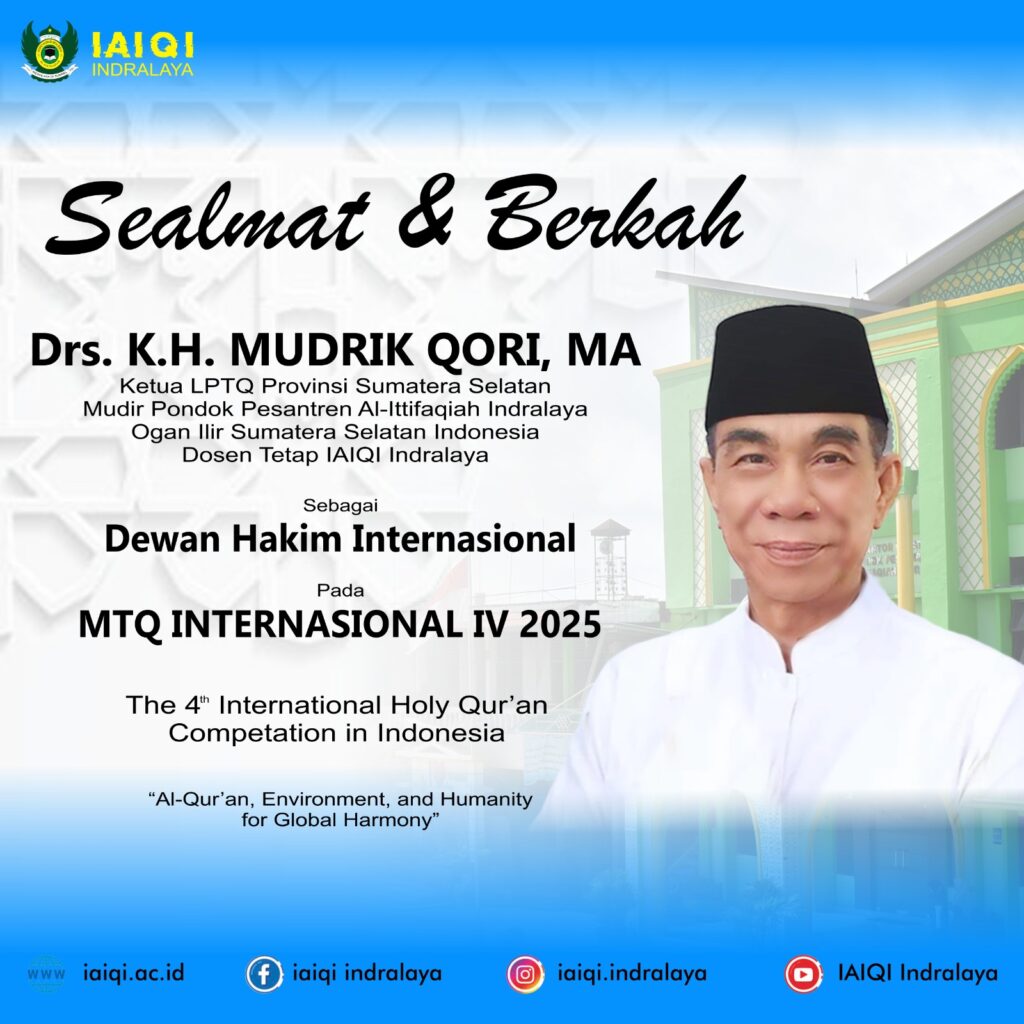 Jakarta, 28 Januari 2025 – Kabar membanggakan datang dari dunia akademik dan keislaman Indonesia. Drs. K.H. Mudrik Qori, M.A., dosen tetap Program Studi Pendidikan Agama Islam di Institut Agama Islam Al-Qur’an Al-Ittifaqiah (IAIQI) Indralaya, kembali mengharumkan nama bangsa. Beliau resmi mendapat amanah sebagai dewan hakim internasional dalam Musabaqah Tilawatil Qur’an (MTQ) Internasional ke-4 yang akan digelar di Jakarta pada 28 Januari – 2 Februari 2025.